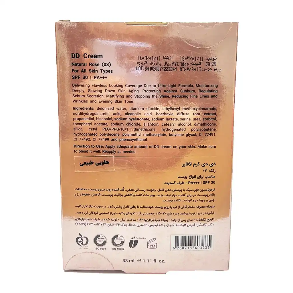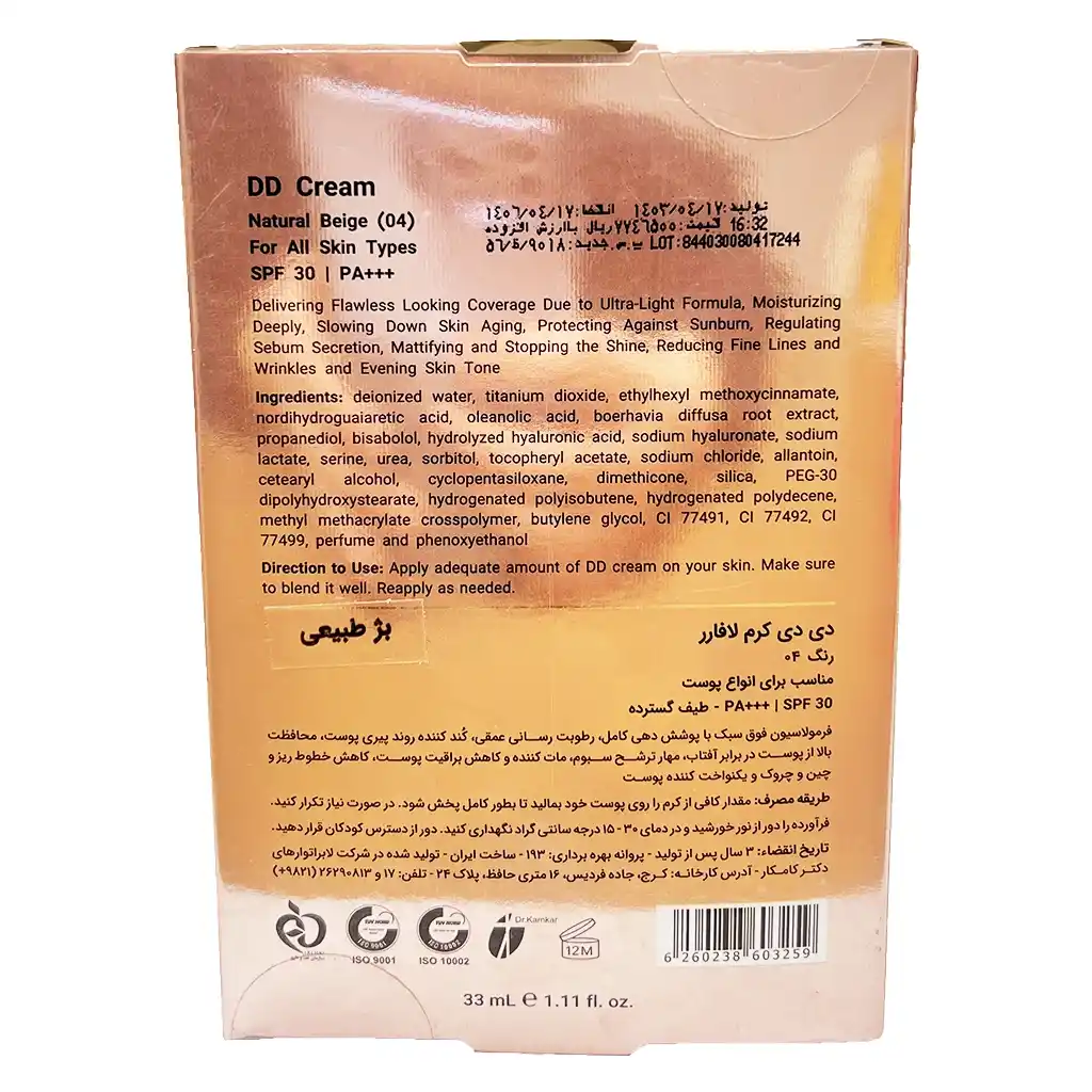 دی دی کرم لافارر مناسب انواع پوست | کرم چندکاره با پوششدهی طبیعی و مراقبت از پوستدی دی کرم لافارر یک محصول چندکاره است که ترکیبی از کرم مرطوبکننده، ضد آفتاب، کرم پوشاننده و درمانی را در یک محصول ارائه میدهد. این کرم با فرمولاسیون سبک و ملایم، مناسب انواع پوستها (چرب، خشک، مختلط و حساس) است و با خواص آبرسانی، ضدآفتاب و ضدپیری، به بهبود ظاهر پوست کمک میکند. دی دی کرم لافارر علاوه بر پوششدهی طبیعی و یکنواخت، پوست را نرم، مرطوب و محافظتشده در برابر آسیبهای محیطی و نور خورشید نگه میدارد.