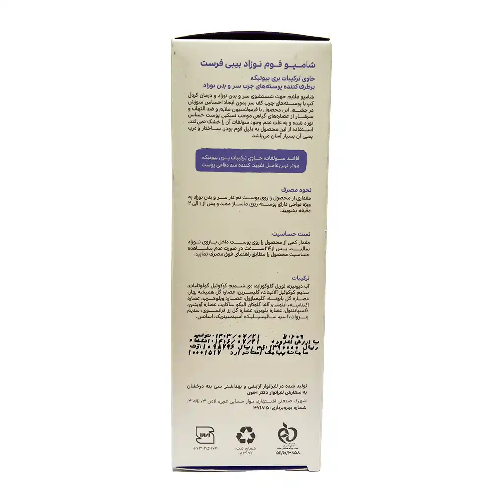 شامپو فوم نوزاد بیبی فرست | پاککننده ملایم و بدون سوزش چشم مناسب پوست حساس نوزادانشامپو فوم نوزاد بیبی فرست یک پاککننده بسیار ملایم و تخصصی برای شستشوی مو و پوست سر نوزادان است. این شامپو با فرمولاسیون بدون سولفات و pH متعادل، فاقد ترکیبات صابونی، پارابن، الکل و اسانسهای تحریککننده بوده و از چشم نوزاد نمیسوزاند.