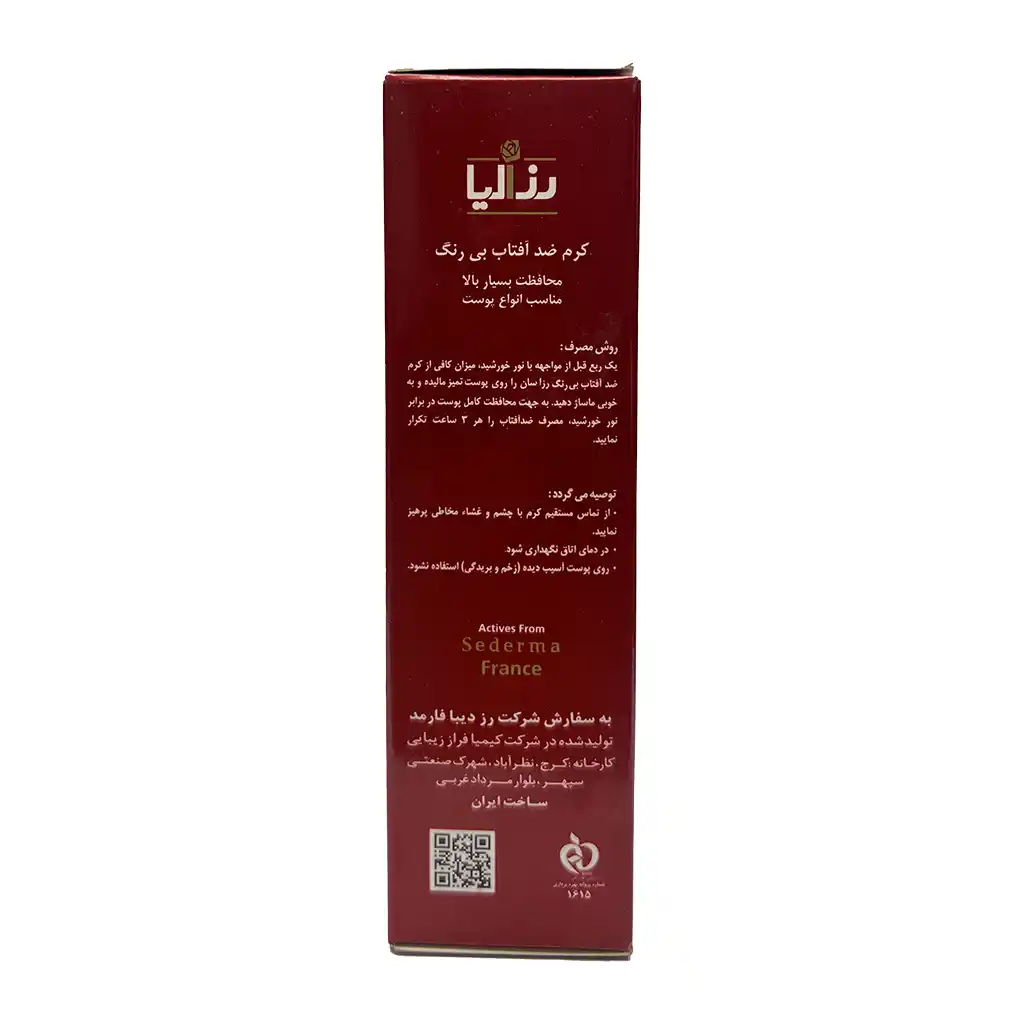 کرم ضد آفتاب بیرنگ مناسب انواع پوست رزالیا | محافظت عالی از پوست در برابر آفتابکرم ضد آفتاب بیرنگ مناسب انواع پوست رزالیا محصولی عالی برای محافظت از پوست در برابر آسیبهای ناشی از تابش مستقیم خورشید است. این کرم با فرمولاسیون ویژه خود از پوست در برابر UVA و UVB محافظت کرده و از پیری زودرس پوست و بروز لکهای آفتاب جلوگیری میکند. با بافت سبک و بیرنگ خود، مناسب برای تمامی انواع پوست، از جمله پوستهای حساس و خشک است.