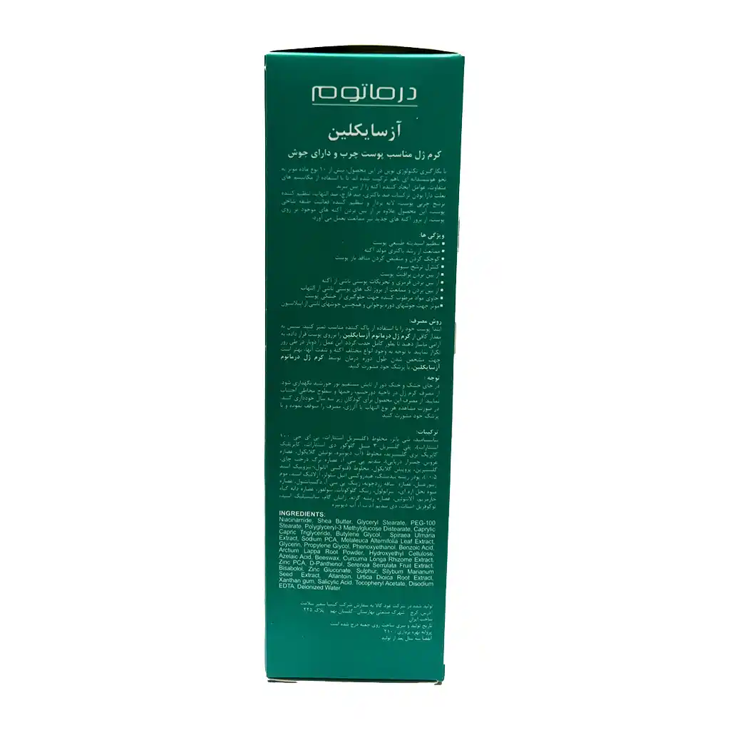 کرم ژل مناسب پوست چرب و دارای جوش آزسایکلین درماتوم | کنترل چربی، ضدجوش و کمک به شفافیت پوستکرم ژل مناسب پوست چرب و دارای جوش آزسایکلین درماتوم محصولی تخصصی برای مراقبت روزانه از پوستهای چرب، مختلط و مستعد آکنه است. این محصول با بافت سبک ژلی-کرم و ترکیبات ضدالتهاب و تنظیمکننده چربی، به کاهش جوش، برق پوست و جلوگیری از انسداد منافذ کمک میکند. فرمولاسیون فاقد چربی آن، بدون ایجاد احساس سنگینی یا براقیت، پوست را نرم، شفاف و مات نگه میدارد.